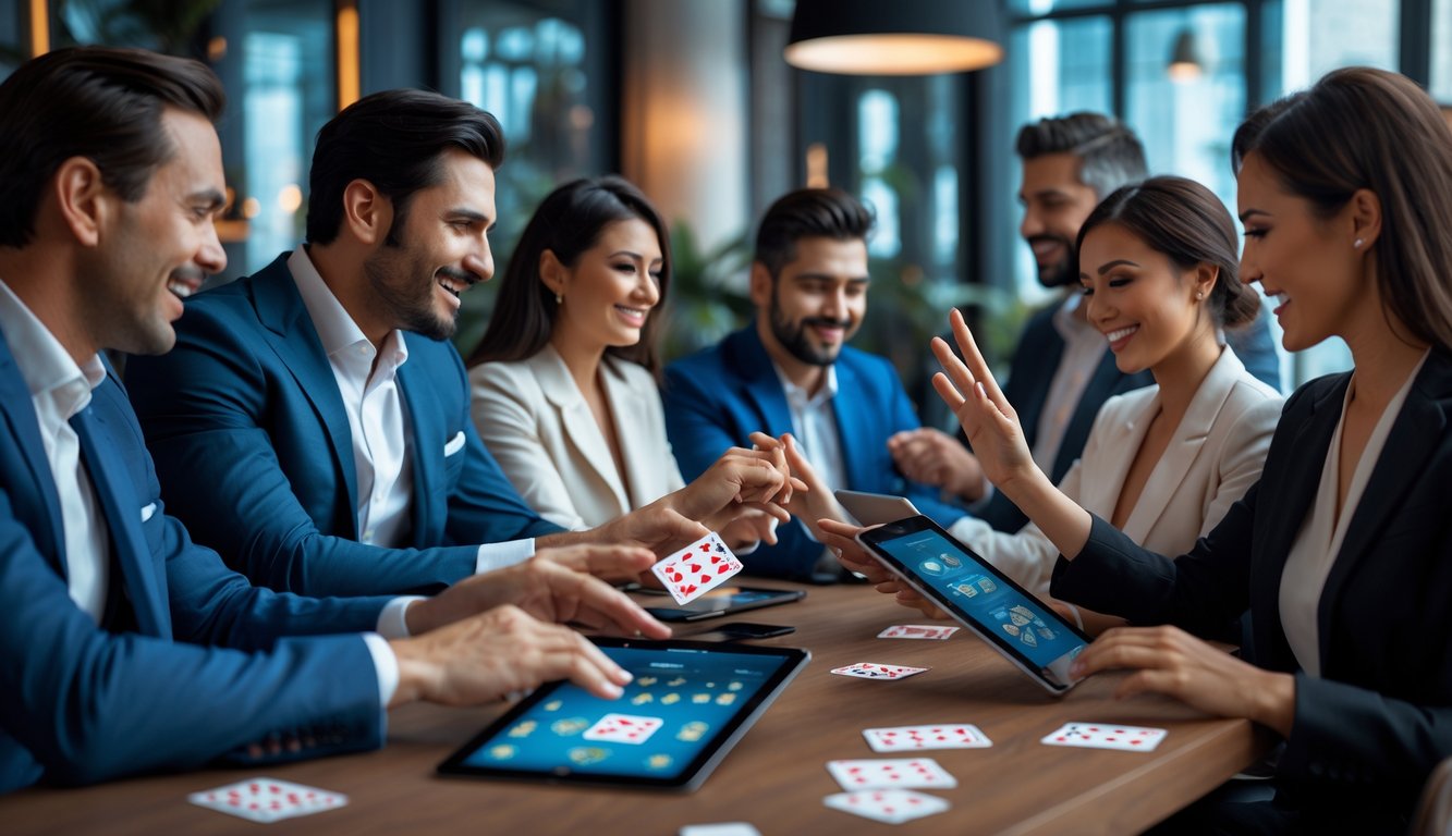 Sekelompok orang dewasa sedang bermain permainan Capsa online menggunakan perangkat digital di ruangan yang nyaman dan modern.