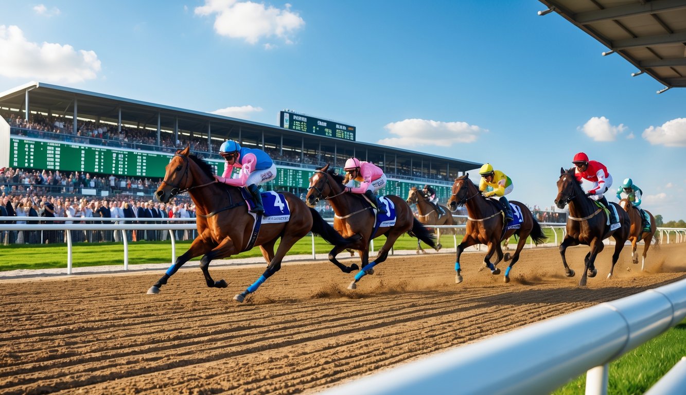 Balapan kuda dengan beberapa joki berlari di lintasan dengan penonton menyaksikan di tribun.