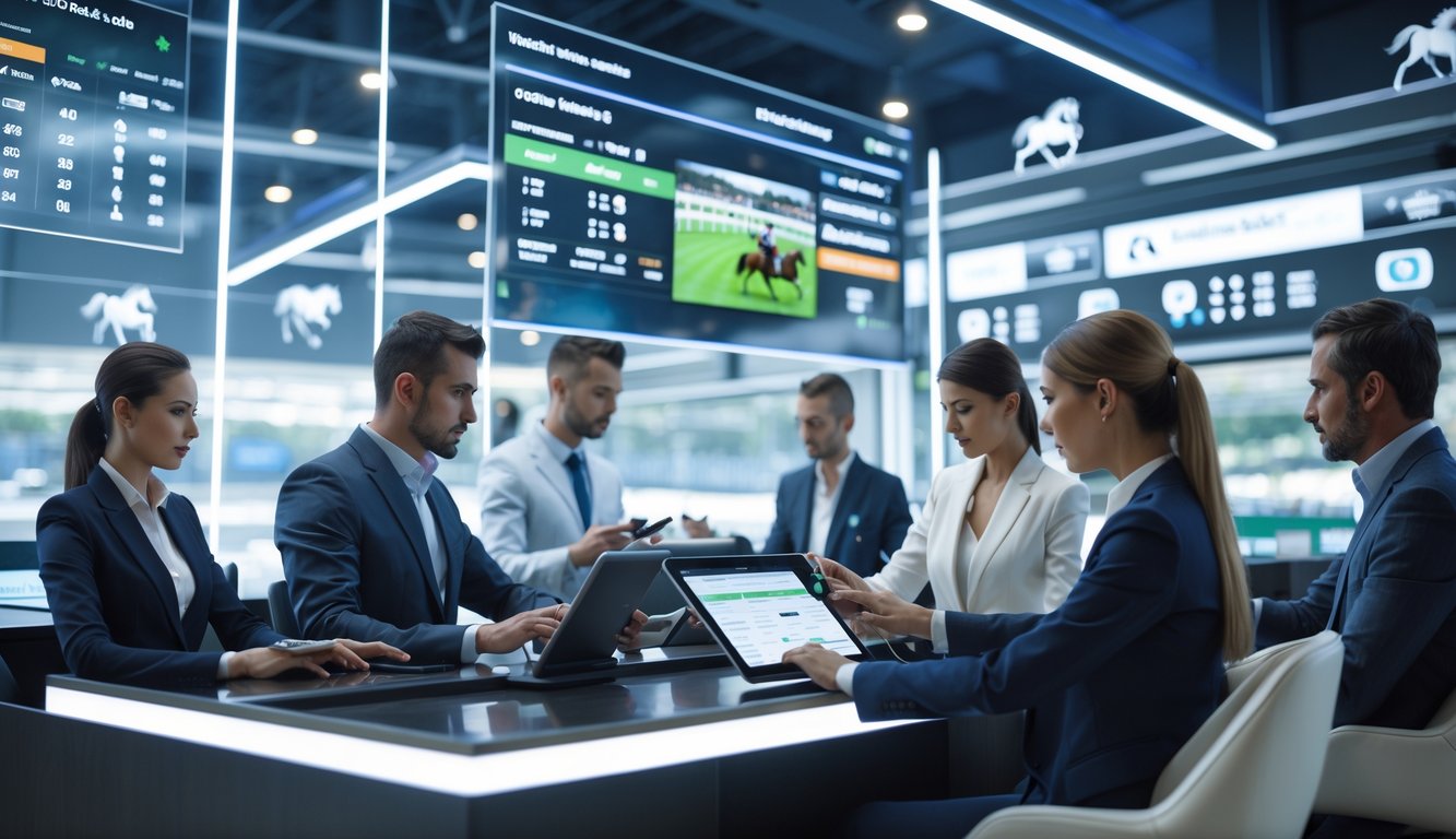 Beberapa orang profesional sedang menggunakan layar digital untuk memasang taruhan balap kuda secara online di ruang modern.