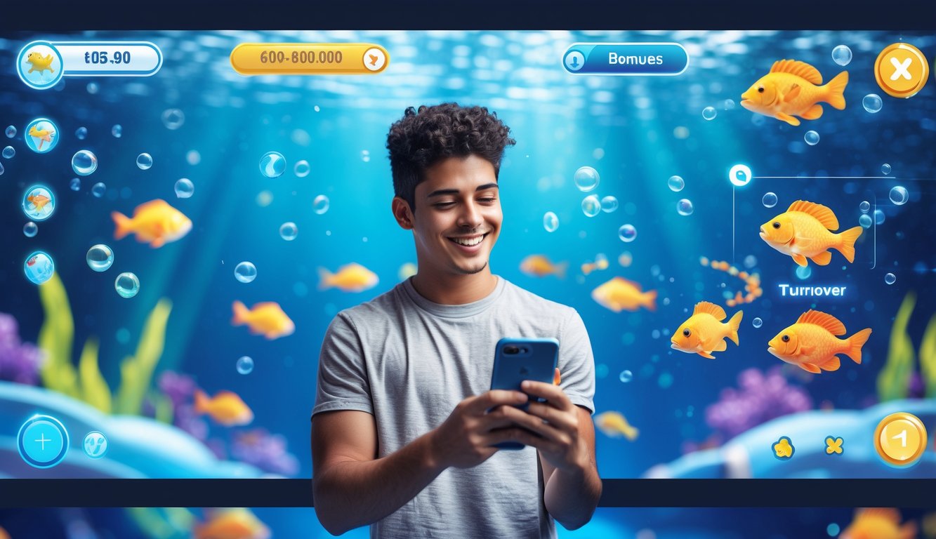 Seorang dewasa muda sedang bermain game menembak ikan di perangkat digital dengan latar bawah laut berwarna-warni.